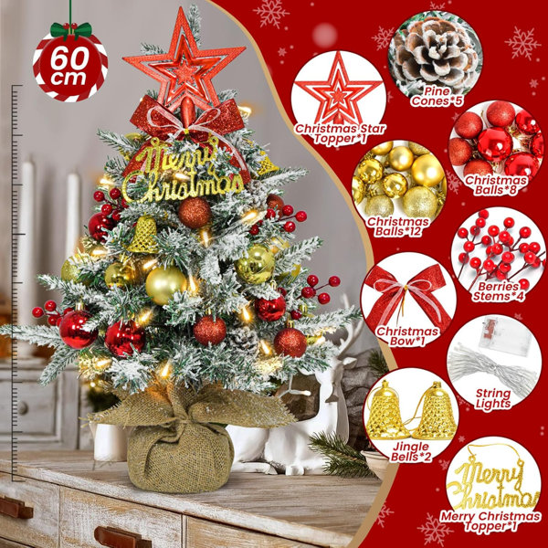 The mini Christmas tree is adorned with warm white LED lights that emit a soft, cosy glow, filling your home with a festive Christmas spirit. With two lighting modes—steady light and flashing light—it creates the perfect atmosphere for cosy moments with family.This beautiful prelit christmas tree is the ideal decoration for the Advent and Christmas season. Whether on your desk, windowsill, mantelpiece, in the living room, office, caravan, bedroom, children's room, dining room, or school, it spreads festive cheer and brings the magic of Christmas into every space.The mini Christmas tree comes with charming accessories: baubles, red berries, pine cones, bells, a tree topper, ribbons, and a "MERRY CHRISTMAS" banner. The simple and fun decorating invites you to create unforgettable Christmas moments with your family while enjoying a warm, heartwarming atmosphere.
