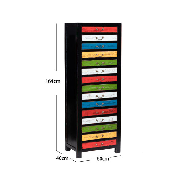 This filing cabinet comes with 15 drawers which are placed in a stacking manner. Each drawer is hand-painted in a different colour which collectively adds vibrancy to the cabinet. The drawers can be opened using u-shaped copper handles. It is made out of sold elm.