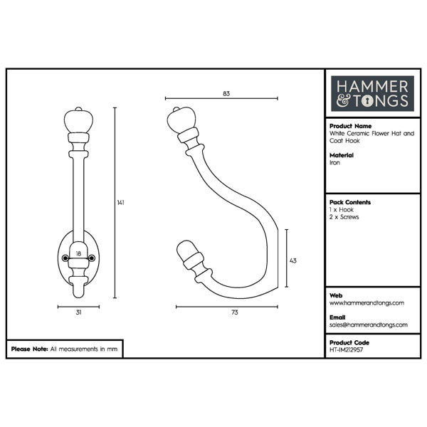 Add an authentic antique finish to any cloakroom, hallway or bedroom door with our Hammer & Tongs Ceramic Flower Hat & Coat Hook. Carefully crafted from iron with a classic powder-coated finish, this durable dual-pronged hook features an ornate ceramic floral decoration fit to grace any space with a touch of Georgian charm and elegance.