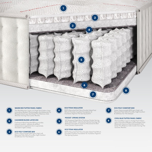 Crafted with care, this hand-crafted mattress features dual-sided pocket springs, offering cooling technology on one side and warming technology on the other. Say goodbye to uncomfortable nights, as this mattress features amazing fabrics designed to keep you cool in the summer and warm in the winter.